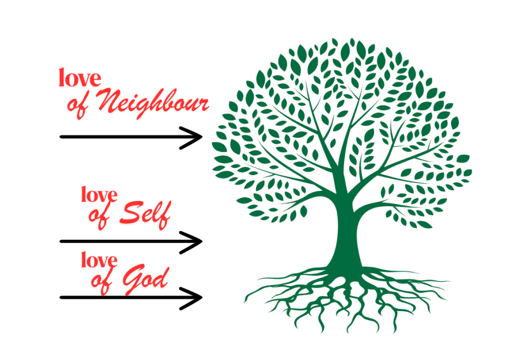 மேற்காணும் மூன்றையும் மரம் என்னும் உருவகத்தோடு ஒப்பிட்டால், ‘இறையன்பு’ மரத்தின் வேர் போலவும், ‘தன்னன்பு’ மரத்தின் தண்டு போலவும், ‘பிறரன்பு’ மரத்தின் கிளை போலவும் இருக்கிறது.