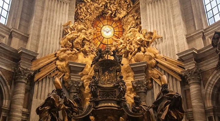 In Saint Peter’s Basilica in Rome, we are struck by the large alabaster window on the back wall of the apse that depicts the Holy Spirit in the form of a dove. Below the window is an ancient wooden chair, believed to have been used by Saint Peter. Surrounding the chair are statues of four early doctors of the Church. Two of them represent the Eastern Church: Saint John Chrysostom and St. Athanasius. Two of them represent the Western Church: Saint Ambrose and Saint Augustine. These great saints represent the universality of the Church, both East and West, as well as the unity of their theological teaching with the authority of the Bishop of Rome. Above the chair are two angels jointly holding the triple crown tiara used by the Bishop of Rome, symbolising that he is the father of kings, governor of the world, and vicar of Christ. In their other hands, each angel holds a key, symbolising the authority of the Bishop of Rome in matters of faith and morals.