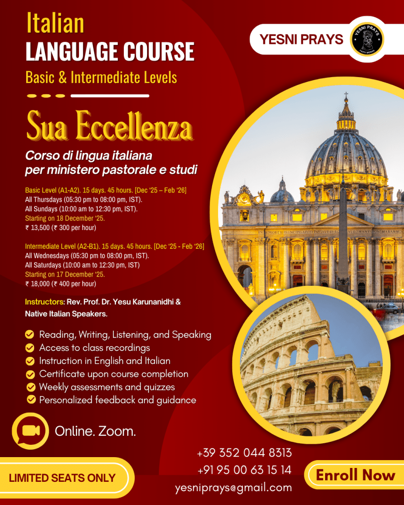 Session II of Sua Eccellenza. Italian Language Course for Ministry and Study. Basic Level & Intermediate Level in Dec ’25 – Feb ’26.